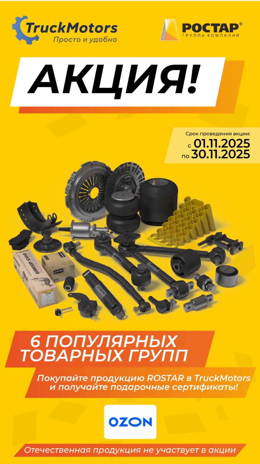 Уважаемые партнеры! C 01.11.2025 по 30.11.2025г. покупайте определенную продукцию бренда ROSTAR в ассортименте ТракМоторс и получайте отличные подарки - сертификаты OZON!
