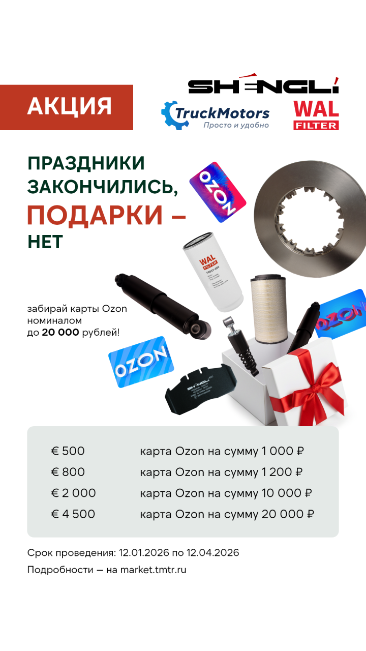 Уважаемые партнеры! С 12 января 2026 по 12 апреля 2026г. покупайте любую продукцию бренда SHENGLI И WAL (оригинал для китайских грузовиков) в ассортименте ТruckMotors и получайте отличные подарки - сертификаты OZON!